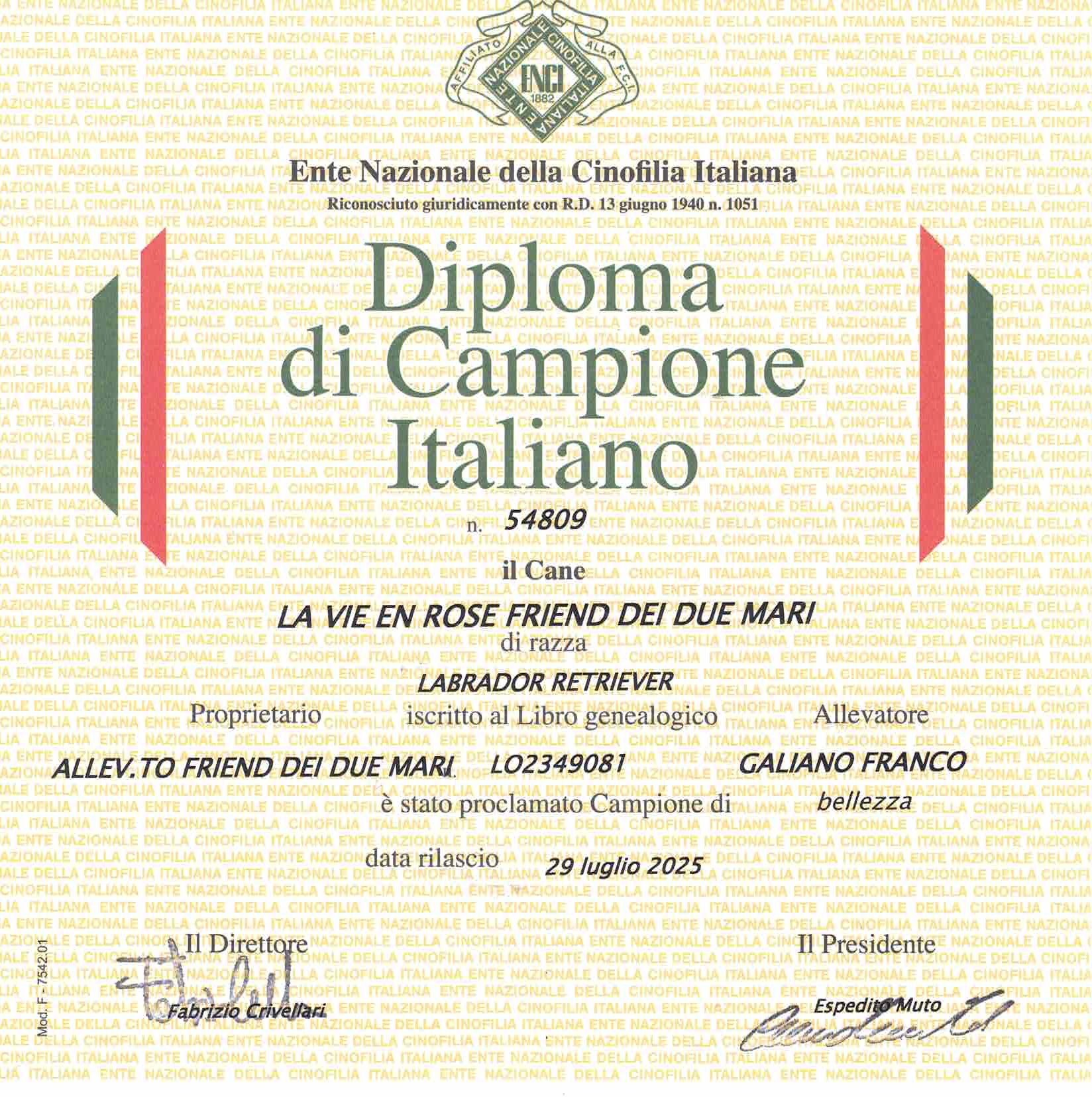Siamo orgogliosi di comunicare che La Vie En Rose Friend dei Due Mari ha concluso il suo percorso espositivo in Italia, il 05 luglio 2025, nell’ambito del Raduno RCI all’interno di ENCI Village di Campo Felice con il conseguimento del titolo di Campione Italiano di Bellezza.